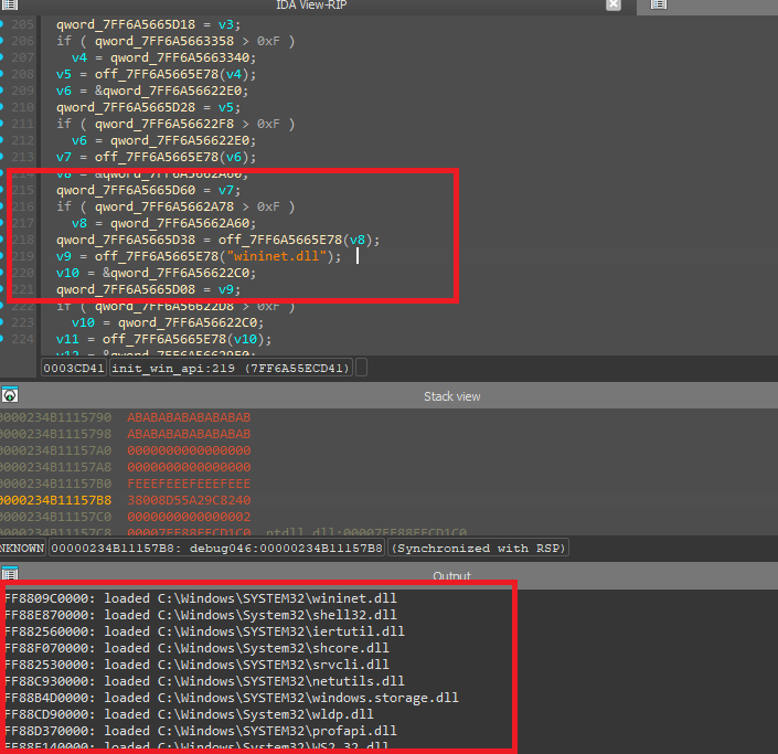Rather than statically importing Windows APIs, cptchbuild.bin dynamically resolves required functions at runtime. DLL names and API strings are not present in plaintext and are instead decrypted during execution. This technique helps evade static signature-based detection and complicates automated analysis.