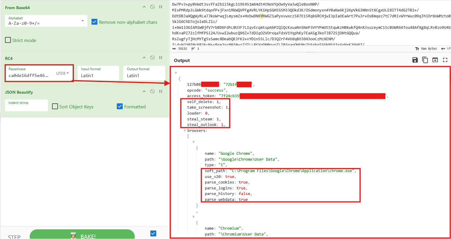 The decrypted configuration contains a unique message identifier, an opcode indicating request status, and an access token used to validate the communication session. In addition, it defines a comprehensive set of operational instructions that dictate what data should be collected and how the stealer should operate.
