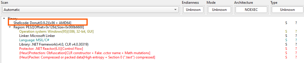 Initial static triage identifies this file as Donut-generated shellcode. Donut is a popular shellcode generator that embeds an entire PE or .NET assembly into a loader stub and protects it using the Chaskey block cipher.