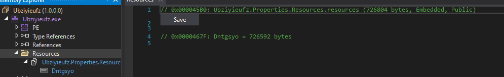 Inspection in dnSpy reveals that the assembly contains an embedded resource with a randomly generated name. The resource does not resemble legitimate application data and is unusually large, strongly indicating that it contains an additional payload.