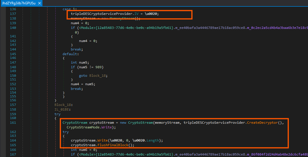 The embedded resource is both encrypted and compressed, with the transformation occurring entirely during execution. The decrypted payload only exists in memory for a short period before being loaded as a secondary .NET assembly.