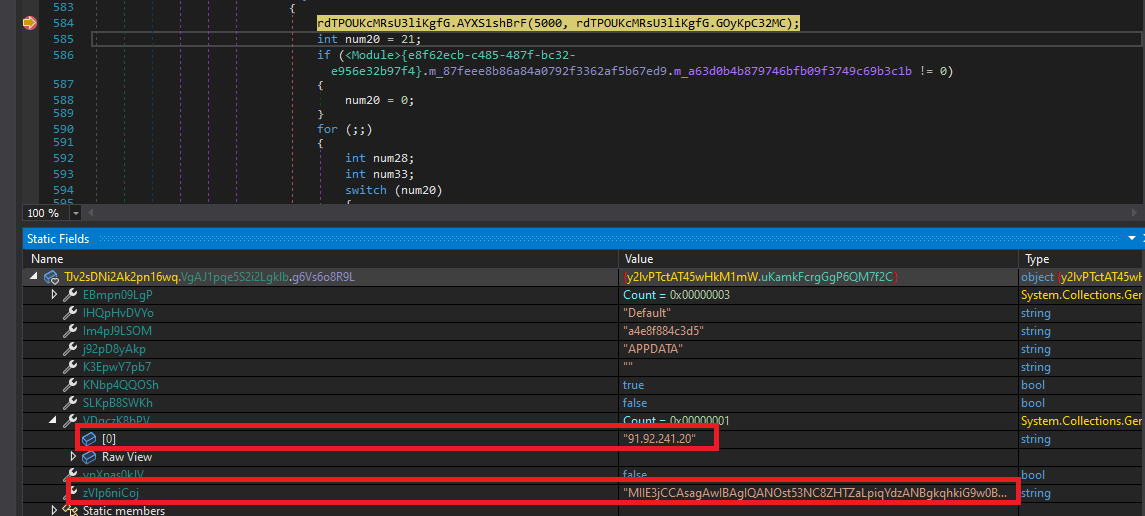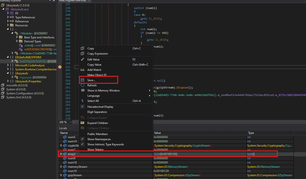 By placing a breakpoint at the end of the decryption and decompression routine, the fully reconstructed payload can be intercepted. At this point, the decrypted byte array contains the complete assembly and can be dumped directly from memory.