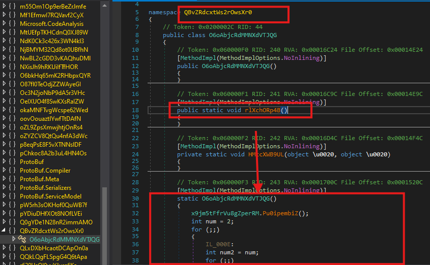 The execution of the malware begins in the method rlXchORp4B(), which resides in Namespace QBvZRdcxtWs2rOwsXr0, in class O6oAbjcRdMMNXdVTJQG