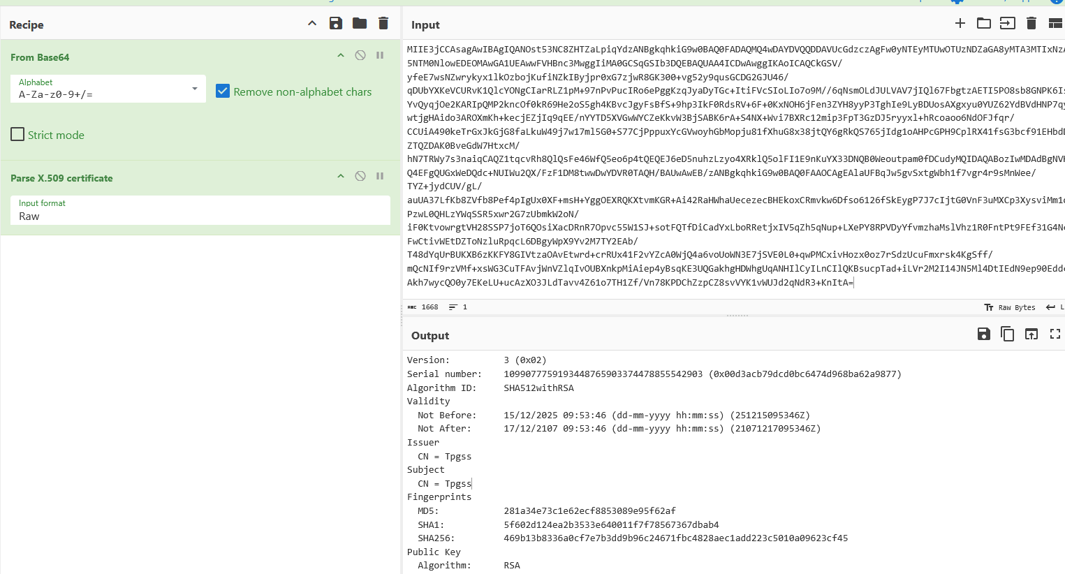 | X.509 Certificate | SHA-256: 469b13b8336a0cf7e7b3dd9b96c24671fbc4828aec1add223c5010a09623cf45;Subject CN: Tpgss; Issuer CN: Tpgss |