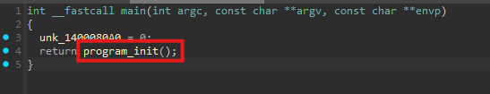 Execution starts in the main(...) function, which contains only a single meaningful call that we renamed to program_init(). This function serves as the entry point for the malware’s execution flow.