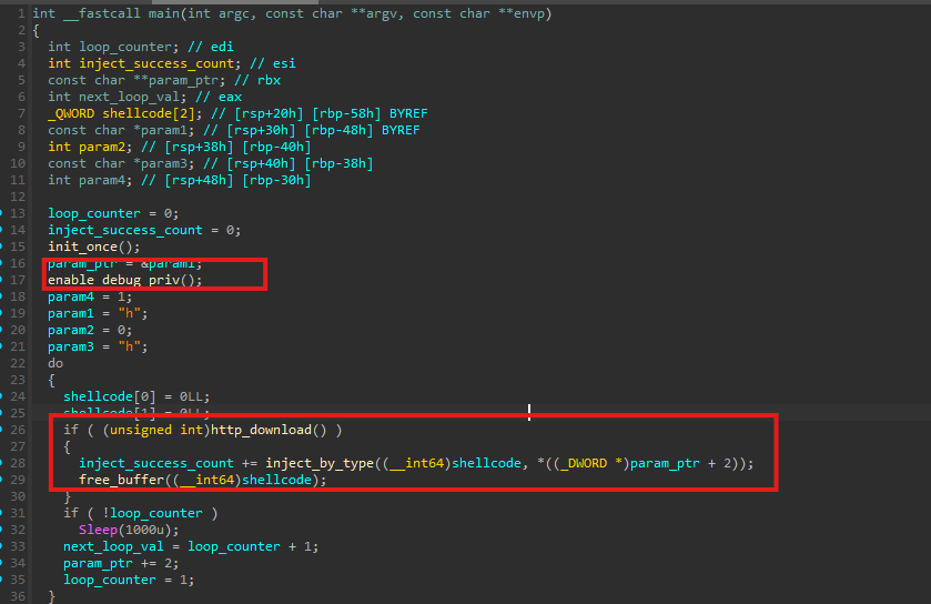 Once suitable target process IDs are identified, the malware proceeds to download the payload over HTTP using the download_payload() function. The HTTP request uses a custom header: User-Agent: Loader