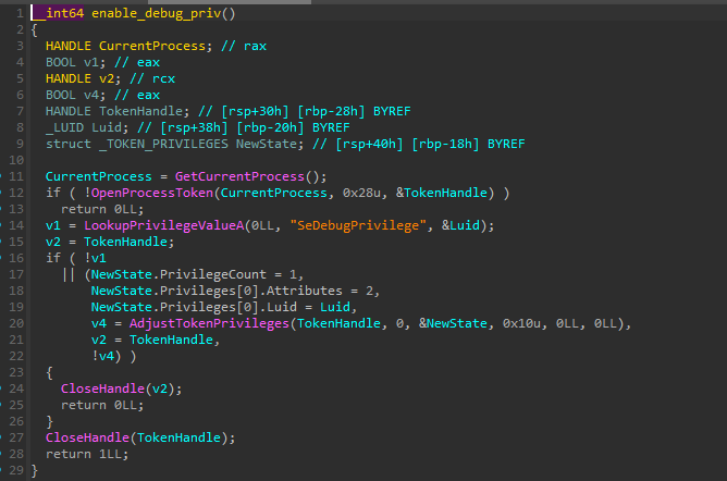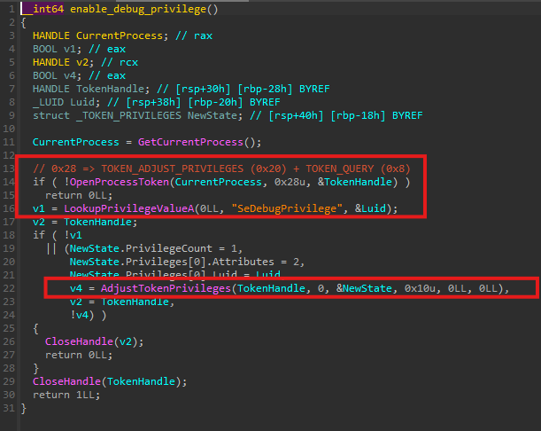 As the first step, the malware enables SeDebugPrivilege. This privilege allows the process to open handles to other running processes with elevated access rights, which is required for subsequent injection activity.