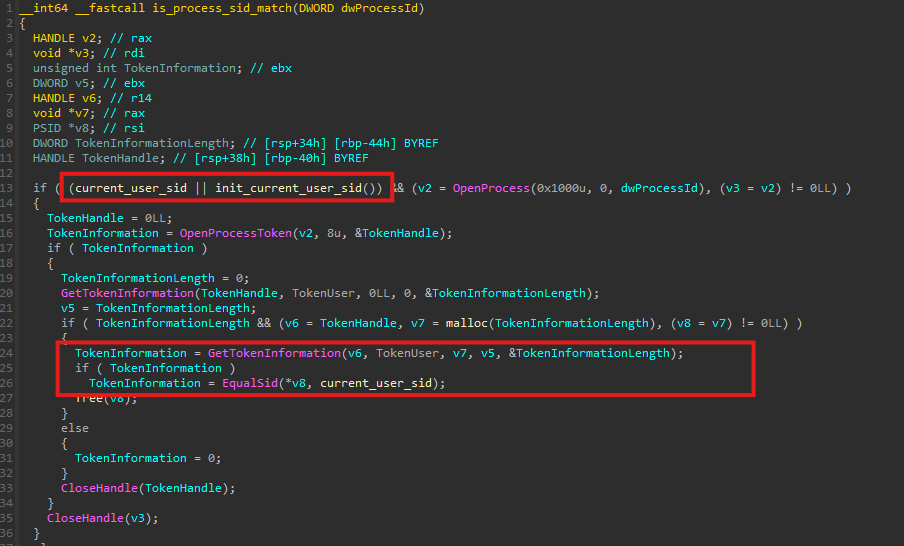 During enumeration, each candidate process is validated to ensure it is owned by the same user account as the loader. This check is performed by comparing Security Identifiers (SID) and is implemented in the helper function is_process_sid_match(). This restriction reduces the risk of permission failures.